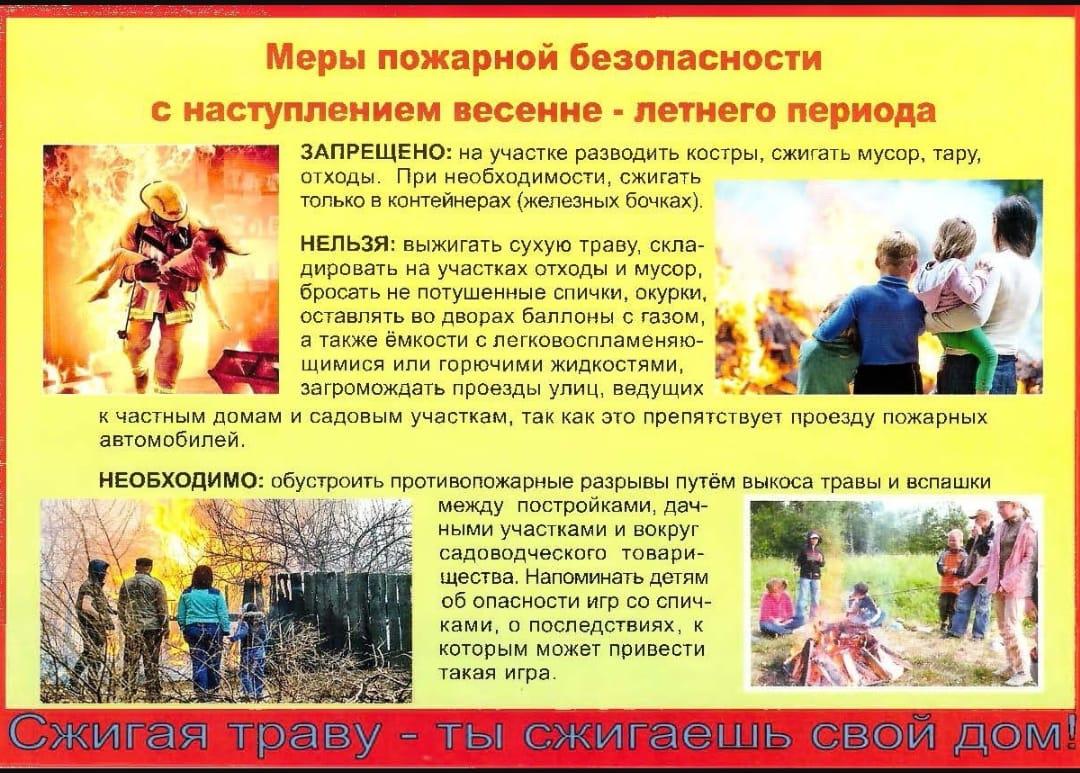 21.06.2024с наступлением весенне - летнего периодаЗАПРЕЩЕНО: на участке разводить костры, сжигать мусор, тару, отходы. При необходимости, сжигать только в контейнерах (железных бочках).НЕЛЬЗЯ: выжигать сухую траву, складировать на участках отходы и мусор, бросать не потушенные спички, окурки, оставлять во дворах баллоны с газом, а также ёмкости с легковоспламеняющимися или горючими жидкостями, загромождать проезды улиц, ведущих к частным домам и садовым участкам, так как это препятствует проезду пожарных автомобилей.НЕОБХОДИМО: обустроить противопожарные разрывы путём